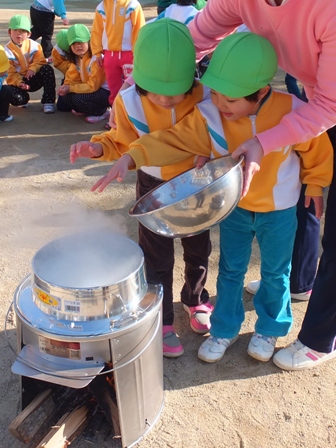 こういう特別な行事を行なうと園児らの表情がさらに生き生きとするようで、慣れない手つきで野菜を切ったり、釜に入れたりするのはとても貴重な体験です。家庭では「七草粥」を食べることも少ないでしょうからなおさらですね。