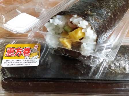 2014年02月04日(火) 住職ブログ 恵方巻き 昨日は節分でしたが、ここ数年で「恵方巻き」がすっかり定着ましたね。正月が過ぎた頃からかテレビの宣伝、新聞のチラシ、また各方面から「恵方巻き」の情報が次々と入ります。「恵方巻き」の起源はどうもはっきりしませんが、こうした世間のムードに乗って我が家でもいつの間にか食べることが恒例となりました。今年の恵方・東北東に向かって、黙って一気に食べる姿はどう考えてもおかしな光景ですが、こんな事を家族で真剣に(?)やっていること自体、すでに福はやって来ているということなのでしょう。