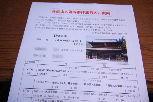 4月の身延団参旅行の案内文を今日、辰巳・平田・久米・今保の4地区は総代を通じて配布をお願いしました。その他のお檀家へは郵送いたします。