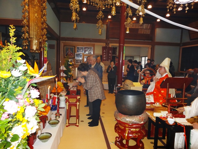 2014年03月30日(日) 住職ブログ 春季彼岸施餓鬼法要 30日午後より「春季彼岸施餓鬼法要」が厳修されまさした。幸い心配されていた雨も上がりました。彼岸法要は他寺ではお彼岸のお中日や明けの日に行なわれる事が多いようですが、当寺では彼岸月の最終日曜日に行っています。境内の桜も次々と花をつけ見るものの心を和ませてくれています。当寺では春の彼岸法要でお立てしたお塔婆を一時しまって取っておき、再び秋の法要でならべて供養します。その後、お塔婆は秋の「川施餓鬼」に持参し海岸等で施餓鬼供養を行いながらお焚き上げしています。