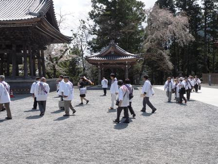 昼食後、バスで西谷を上がり駐車場へ到着。それぞれ行衣、輪袈裟を着用し「輪番奉仕」に向けてお山に上がりました。