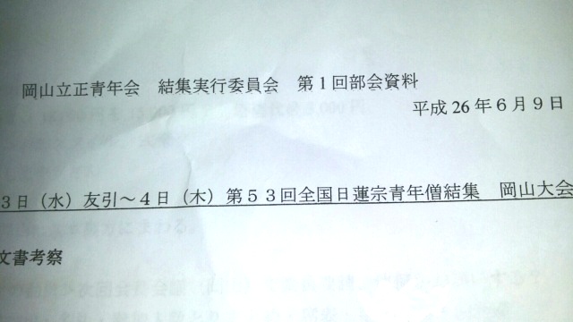 2014年06月09日(月) 住職ブログ 1年後に向けて… 来年の6月に岡山立正青年会が中心となって行われる「第53回全国日蓮宗青年僧結集 岡山大会」に向けた、初めての部会が行われました。なにせ全国から200名を越える青年僧が集います。毎年、当番、会場を変え開催されていますが、主催となると十分な企画と準備、打ち合わせが必要となります。まだまだ先のようですが、多くの意見が出され有意義な会議となりました。