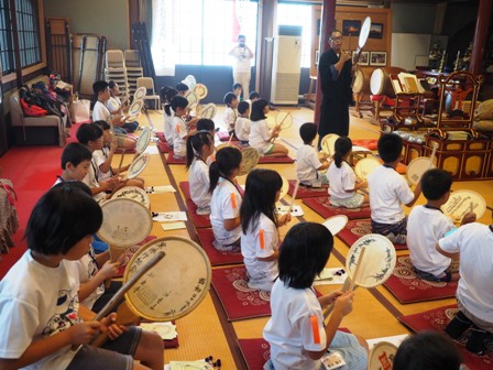 2014年08月25日(月) 住職ブログ てらこや「第3回イキイキ元気子どものつどい」前編 一同、日蓮宗から配布されたそろいのTシャツを着用し、まず、午前中は本堂にてお経練習をはじめ仏事作法、太鼓練習、写経の修行体験を行いました。