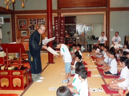 最後は本堂において閉会式。午前中に習ったお経を読み最後...