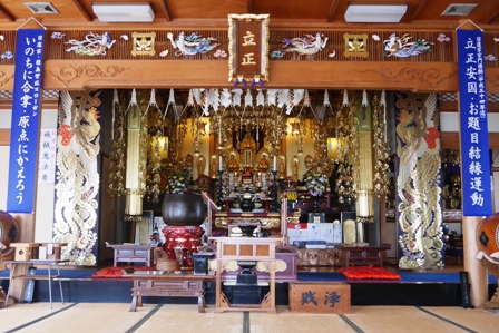 2014年09月16日(火) 住職ブログ 徳島・善学寺参拝 本堂にもお参り。堂内明るく、正面奥に一段上がって内陣ということで、外陣(参拝者が座るところ)がとても広く感じます。 善学寺の背後には徳島の人には馴染み深い眉山があり、とても懐かしいです。一方、あらためて見るとその近さに、近年の異常気象による土砂災害が心配になにます。8月の台風の時は一時避難警戒地域になったとか、今後何もなければいいのですが…。