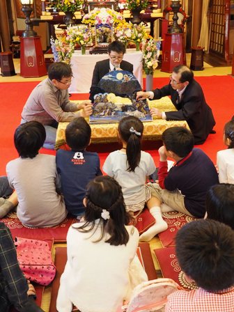 まずはお釈迦さまの生涯を伝えるポップアップ絵本を青年会の皆様に読んでいただきました。