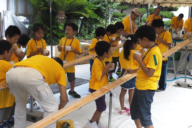 さて、本堂での修行体験の後はお待ちかね、毎回好評の「流しそうめん」が行われました。