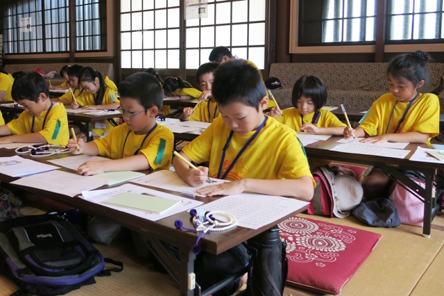 2015年08月25日(火) 住職ブログ 第4回イキイキ元気子どものつどい・前編 途中何度か休憩を入れ今度は写経にも挑戦しました。昨年同様、お題目写経に宝塔偈、そして日蓮聖人の自画像にもチャレンジしました。約40分、静かで落ち着いた雰囲気の中、集中して取り組むことが出来ました。