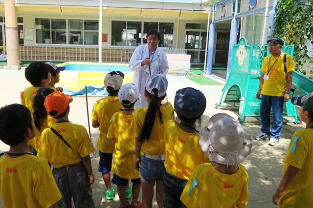 2015年08月26日(水) 住職ブログ 第4回イキイキ元気子どものつどい・後編 お昼の後はお寺から保育園に移動し、「おうさまの科学実験教室(内田正夫先生)」です!まずは晴れ渡った青空の下、園庭で水の性質を使った実験です。子どもたちは疲れ知らずで興味津々の様子。