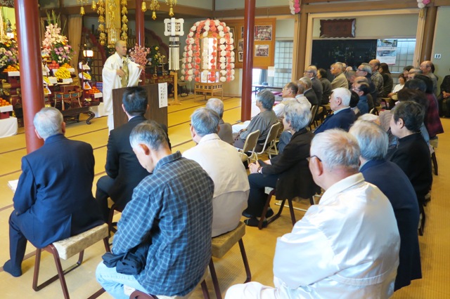 2015年11月18日(水) 住職ブログ 第734遠忌お会式 法要に引き続き、立正青年会でお世話になっている一乗寺・副住職の江口明照上人のご法話を拝聴しました。ご自身の経験と、先師やお題目との不思議なご縁について分かりやすくユーモアを交えお話いただきました。檀信徒もよく理解出来たようです。江口上人をはじめ、お参りいただいたお檀家の皆様たいへんお疲れさまでした。また、お会式を営むにあたり総代、役員の皆様、また掃除、ご接待をいただいた婦人部の皆様、本当にお疲れ様でした。心より感謝申し上げます。