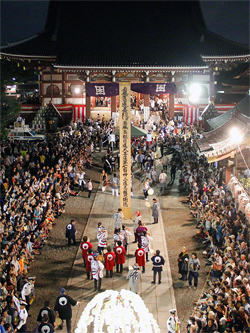 夕方6時から、夜中の12時すぎまで、30万人とも言われる人出のもと、切れ目無く100基を超える万灯行列が続きます。