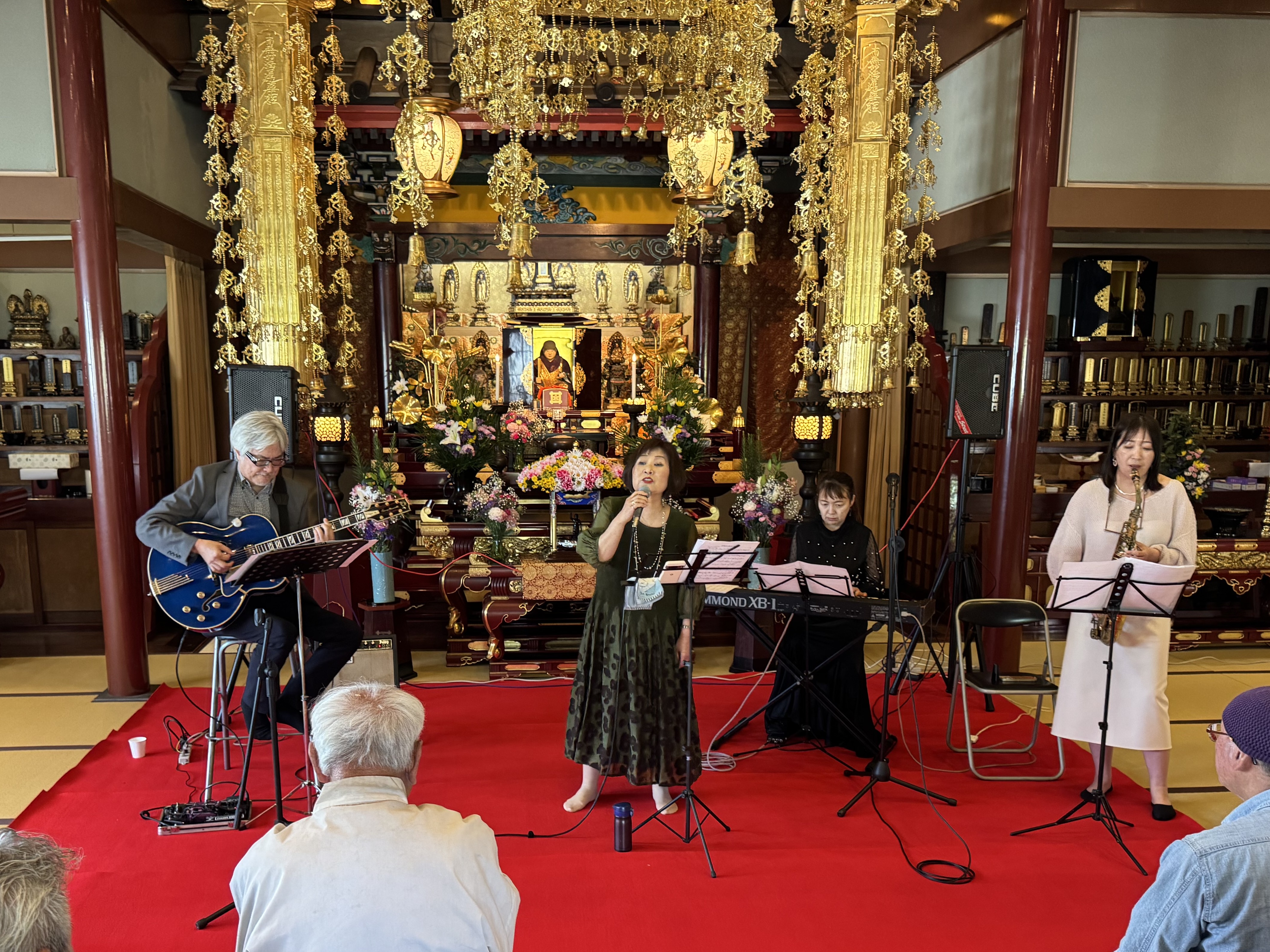 ジャズの演奏は昨年に続いてギター門田信を中心に、ボーカルKIMIE、キーボード角堂りえ、サックス細川由佳の熟練したプレイヤーの皆様。普段は個々に活動されていますが、息の合った演奏を聴かせていただきました。ジャズ以外にも誰もが知る美空ひばりの「愛燦燦」など有名な曲も披露。加えて住職リクエストのサイモン&ガーファンクルの「明日に架ける橋」も情感豊かに再現。あっという間の楽しいひと時でした。来年も4月19日に花まつりコンサートを行う予定です。ぜひ気軽にご参加下さい。