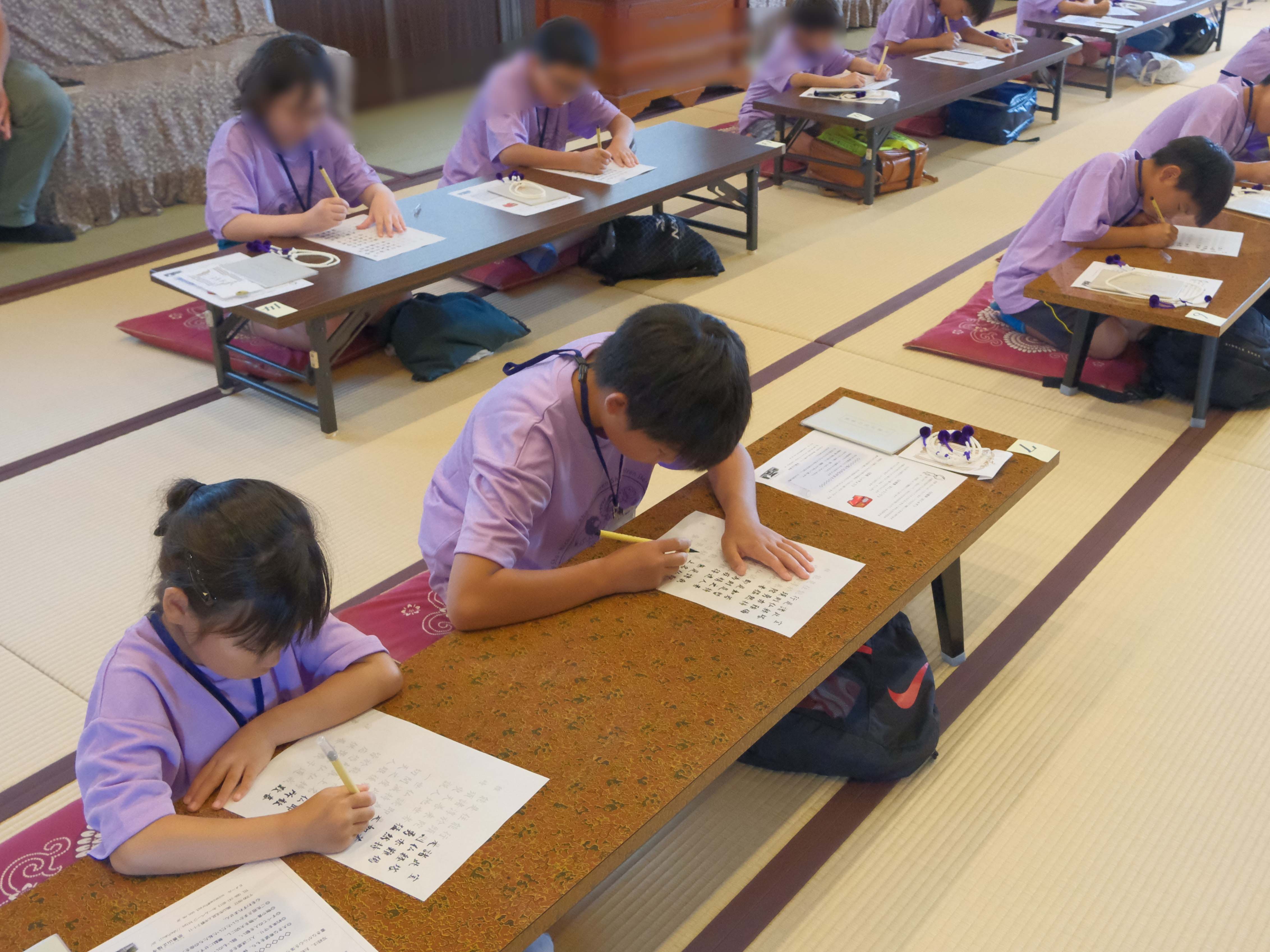 午前中は本堂にてお経練習、写経などを行いました。慣れないお経や仏事作法で戸惑う子どもも多くいましたが、それでも意欲的に取り組みました。