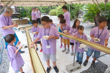 お昼は檀信徒青年会による毎回好評のそうめん流し。竹に流れるそうめんを子どもたちは和気あいあいと楽しみながらいただきました。