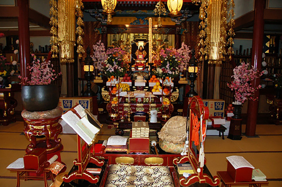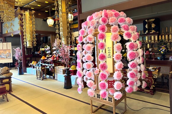 11月 お会式(日蓮聖人ご入滅会) 11月3日(日)午後1時 「お会式」とは日蓮聖人が弘安5(1282)年、現在の東京池上にて61歳でご入滅されたご命日10月13日前後に行なわれる報恩法要のことです。 お会式では日蓮聖人がご入滅された時に季節外れ桜の花が咲いたという故事にもとづき、堂内に桜の造花を飾り付け盛大に法要を行います。 それは日蓮聖人への報恩の気持ちと、法華経・お題目の信仰に出会えた喜びを表わしたものでもあります。